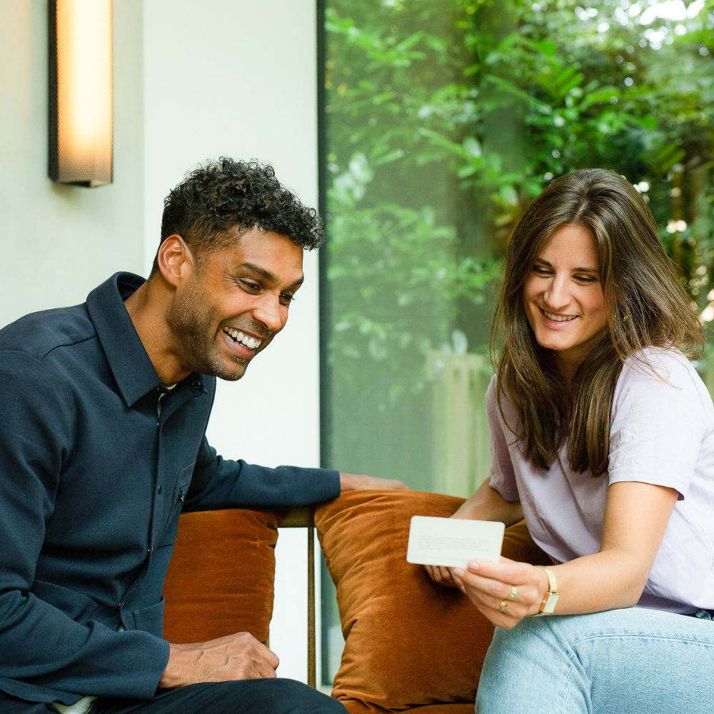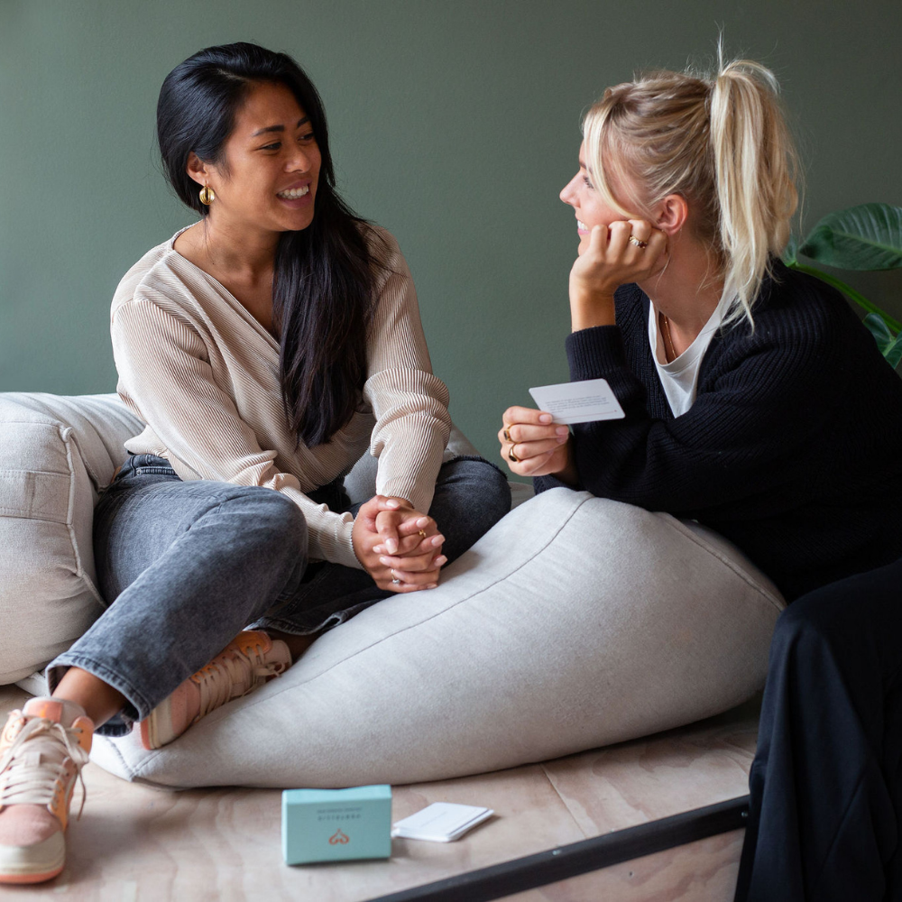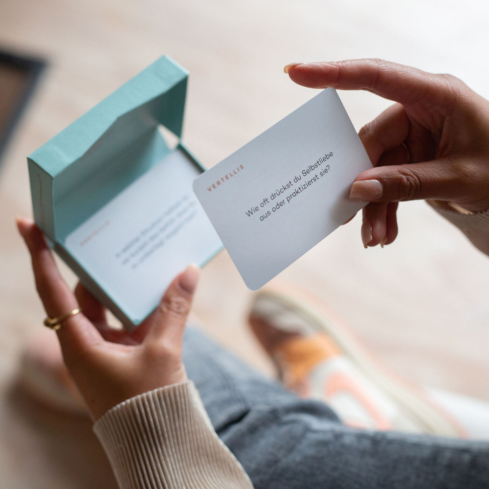 Die Karten kannst du sowohl alleine als auch in der Gruppe nutzen, zum Beispiel bei einem Feierabenddrink am Freitag oder gemütlich zu Hause mit der Familie. Auf der Vorderseite jeder Karte steht ein Text, auf der Rückseite eine Frage.